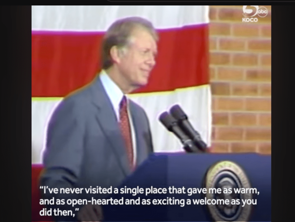 Even towns like Elk City, Oklahoma remember a time when national figures still spoke directly to local communities. Jimmy Carter built much of his campaign on that very idea—making personal promises and treating small towns like they mattered. And when he became President, he was known for keeping those commitments, returning to places others might have forgotten.