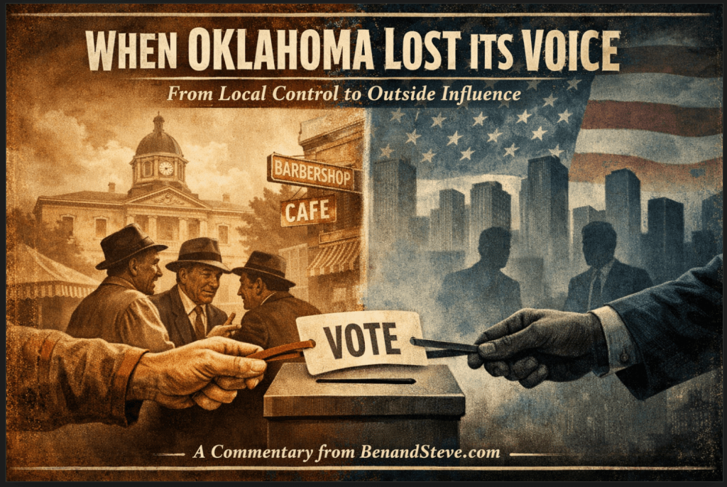 Over time, national political machines and out-of-state interests realized something: Oklahoma was fertile ground. Campaigns stopped being about neighbors convincing neighbors. They became about funding streams, media buys, consultants, and narratives crafted far beyond state lines. The candidates may still live here—but the strategies, the messaging, and often the priorities do not.